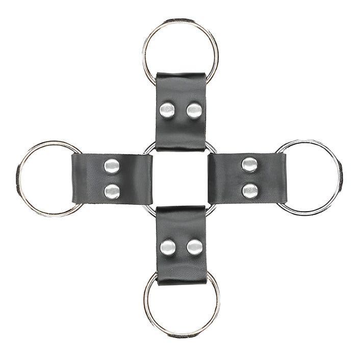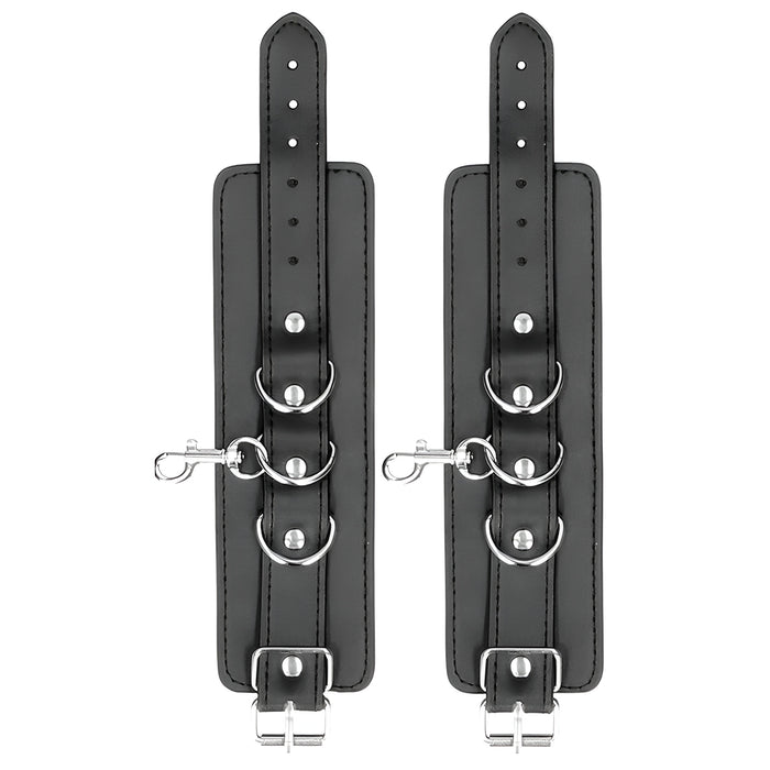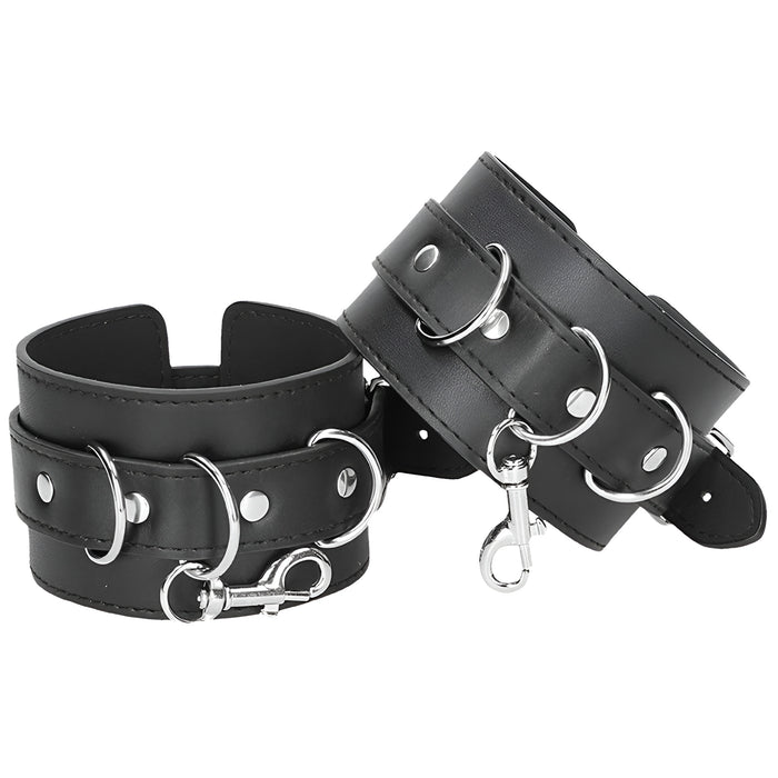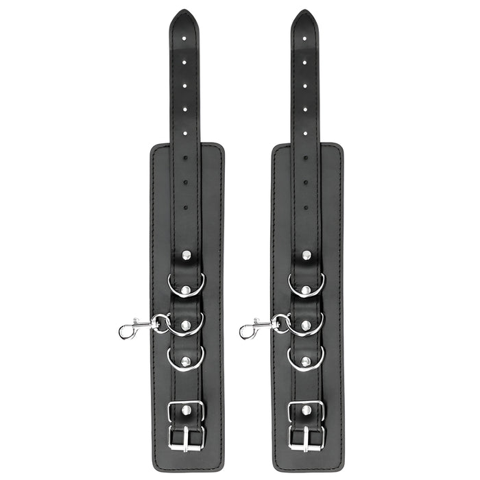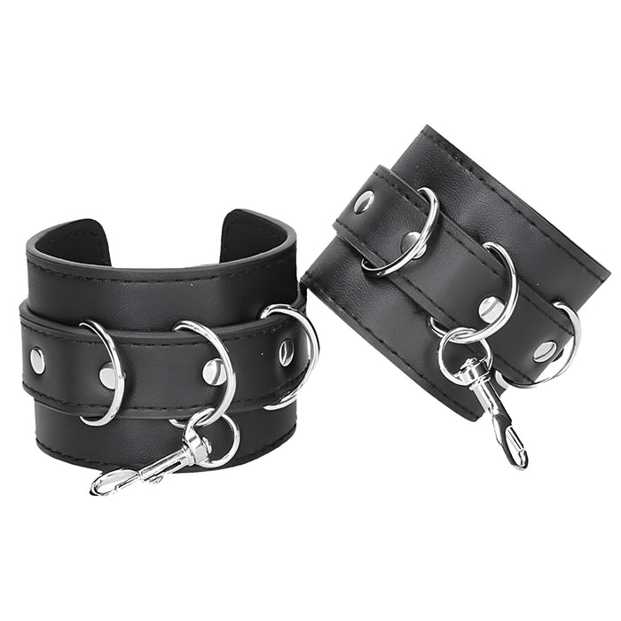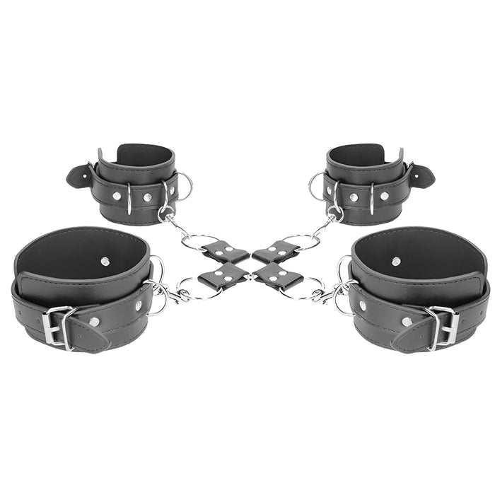 Šis komplekts ir izgatavots no augstas kvalitātes presētas ādas un metāla – ērts, bet izturīgs risinājums jūsu BDSM rotaļām. Roku un kāju saitēm ir elegants izšuvums, 6 regulēšanas caurumi, metāla sprādzes un D veida gredzeni piestiprināšanai.