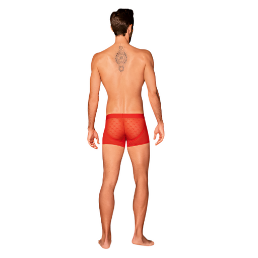 ObsessiveKaislīgi pulsējoši, spilgti sarkani vīriešu šorti Boldero . Šortu sāni un aizmugure ir akcentēti ar daļēji caurspīdīgām tilla vīlēm, kas piešķir p...