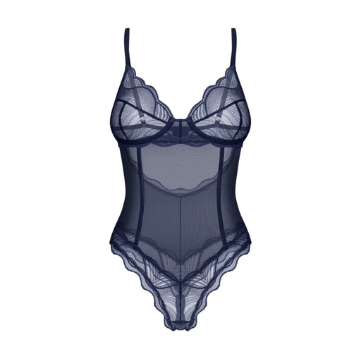 ObsessiveTumši zils, mežģīņots bodijs ir radīts, lai izceltu ķermeņa līnijas un radītu elegantu, bet izteiksmīgu tēlu. Caurspīdīgs audums apvienots ar smalk...