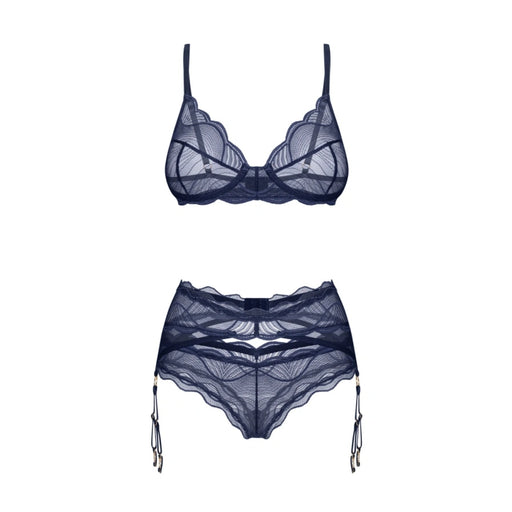 ObsessiveTumši zils mežģīņu apakšveļas komplekts sastāv no krūštura, biksītēm un zeķturiem. Smalkas mežģīnes ar viļņu rakstiem piešķir eleganci, bet vieglai...