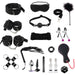 Atklājiet jaunu erotiskās spēles dimensiju ar šo profesionālo 17 detaļu BDSM komplektu. Tajā ietilpst acu maska, ādas ripa, mīksts apkaklis, muti aizsedzoša bumbas josta, kokvilnas virve, zvaniņi, krūšu skavas, mīkstas roku un potīšu saistvielas, vibrators, silikona un metāla ielikņi, kā arī citi aksesuāri, kas bagātina sajūtas un spēles.