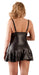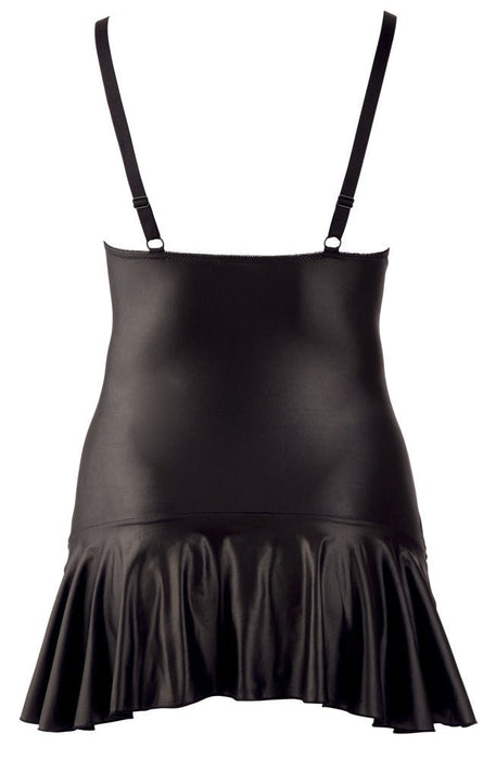 Melna kleita ar regulējamām lencēm, mežģīņu priekšpusi un platiem svārkiem. Necaurspīdīga aizmugure. Materiāli: 92% poliesters, 8% elastāns, mežģīnes 90% poliamīds, 10% elastāns.